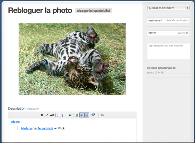 Comme vous le voyez, la description apparaît, mais pas les tags utilisés par la personne que vous rebloguez. À vous donc d’intégrer les vôtres, de modifier, supprimer ou garder le texte de commentaire, et de cliquer sur « Rebloguer le billet ». Il apparaîtra alors ainsi sur votre Tumblr :