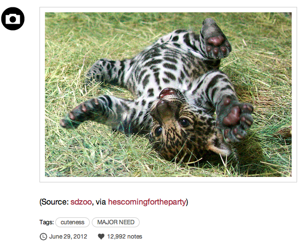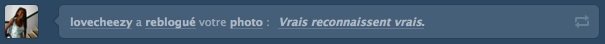 Comme vous le voyez, la source originelle et la personne rebloguée restent indiquées. Sur Tumblr, on rend à César ce qui est à César (tout en défonçant allègrement toutes les notions de droit d’auteur, certes, mais bon). C’est cette facilité de partage qui va peut-être ruiner votre vie sociale vous rendre un peu accro : une main sur la molette de votre souris, faisant défiler incessamment votre Tableau de bord, deux clics pour rebloguer une image qui vous plaît, et quand vous avez atteint la fin des nouveaux posts, il suffit d’actualiser votre dashboard pour avoir de nouveaux contenus… Tout cela est si plaisant et chronophage !