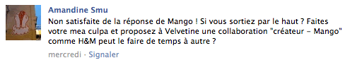 C’était sans compter sur les réseaux sociaux, véritable plaie pour les Goliaths qui voudraient s’asseoir gentiment sur leur David. L’info se balade de mur en mur Facebook, provoquant l’indignation de nombreux internautes, qui postent des messages de soutien à Velvetine et vont jusqu’à créer un sujet sur le forum Facebook de Mango.