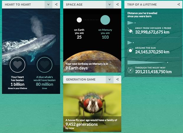 C’est l’occasion d’apprendre par exemple la date de ton anniversaire sur Mercure, le nombre de fois où ton coeur a battu (c’est beaucoup-, le nombre de fois où le coeur d’une baleine a battu (c’est moins), les espèces qu’on a découvert depuis ton premier cri, le nombre d’éruptions volcaniques dans le monde depuis ta naissance ou encore à quel point le trou dans la couche d’ozone a grossi.