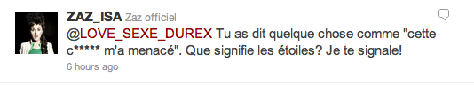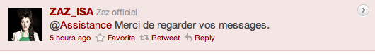 J’ai donc contacté tout à l’heure Delphine de chez Spöka, RP web officielle de la Zaz officielle, qui me confirme bien que ce compte est un fake et que le label ne sait pas trop quoi faire face à tout ça. Bah juste en rétablissant la vérité de façon officielle.